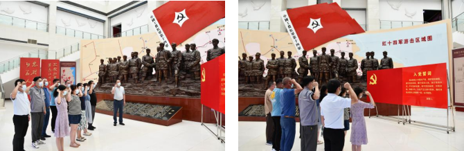 纪念馆大厅摆设着一座雄伟壮观的红军将士群雕,,,,,斗志高昂、意气风发的战士形象,,,,,让各人肃然起敬。。。。。在鲜红的党旗前,,,,,支部党员们重温了入党誓词,,,,,接受了一次心灵的洗礼,,,,,坚定了入党初心和使命。。。。。