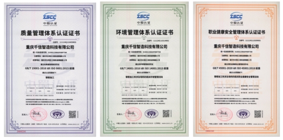 克日,,,,,,,经相关部分严酷审核评估,,,,,,,韦德网站官方入口智造正式获得了ISO9001质量管理系统认证证书、情形管理系统认证证书、职业康健清静管理系统认证证书三证管理系统认证。。。。。。。。